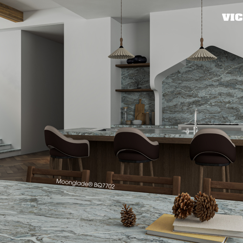 Sản phẩm đá Vicostone nhóm D nổi bật với những đường vân rạn ấn tượng, như những tia sét đánh mạnh mẽ trải dài toàn tấm. Đôi khi là những đường vân mảnh mai trên nền đá hiệu ứng cẩm thạch điểm xuyết xanh nhạt độc đáo, hay bề mặt mô phỏng gần như trọn vẹn những thân gỗ lớn trong các khu rừng nguyên sinh.
