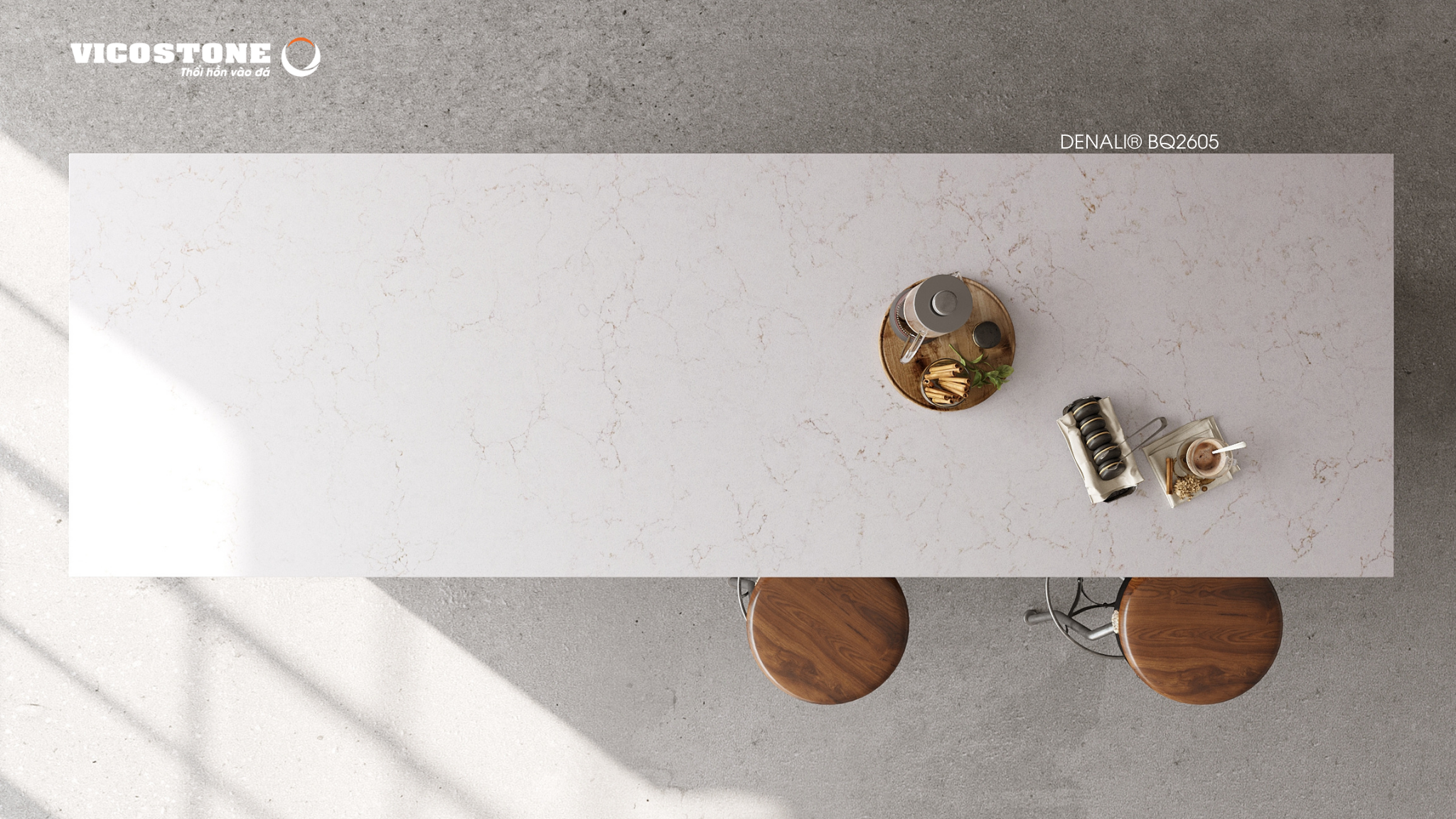 Lấy cảm hứng từ đá cẩm thạch tự nhiên, sản phẩm Vicostone Denali độc đáo với hiệu ứng vân rối màu nâu vàng xuất hiện trên bề mặt nền trắng tinh tế.