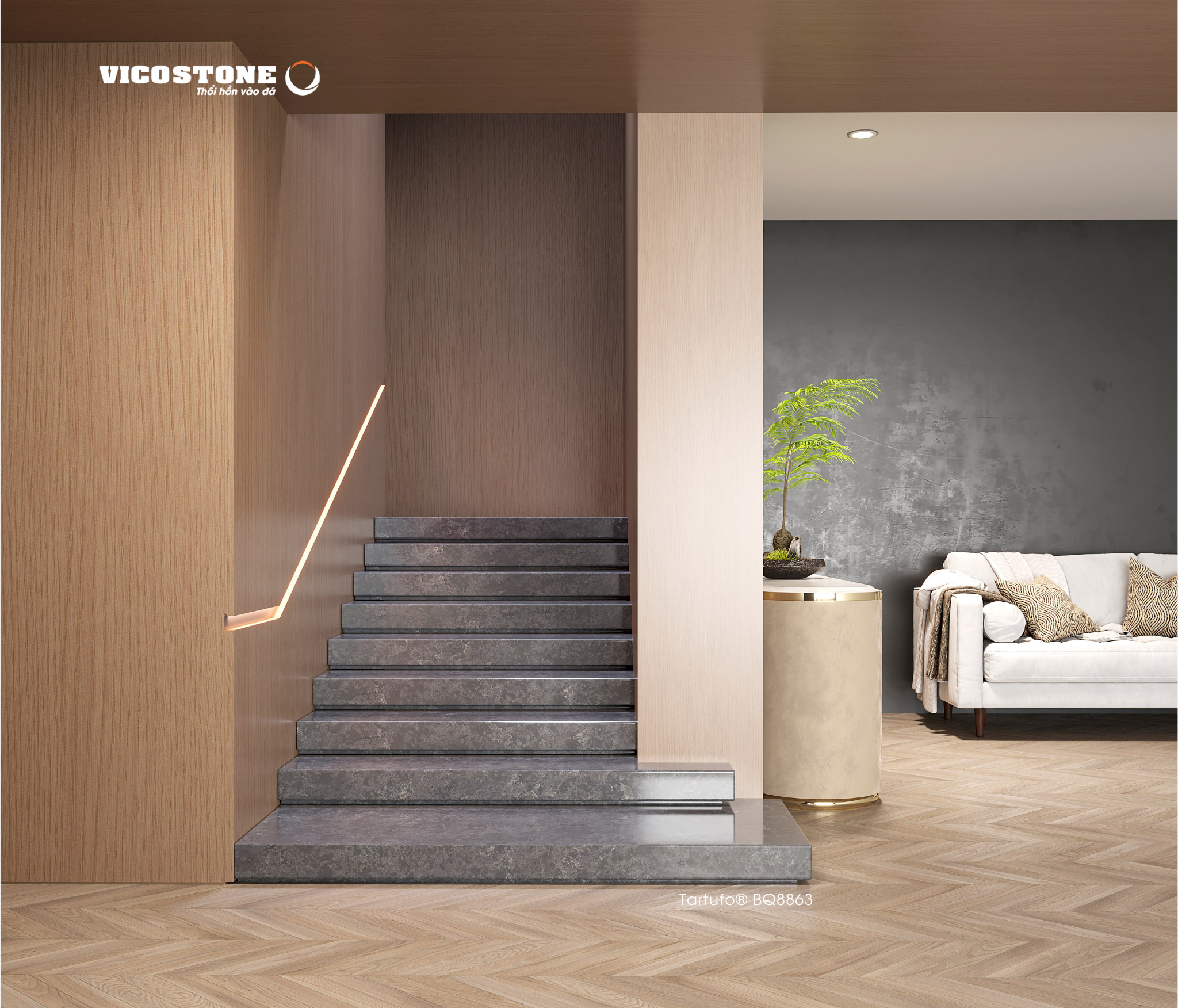 Lấy cảm hứng từ bề mặt giả xi măng (concrete looking) trong các thiết kế hiện đại hoặc mang đậm phong cách urban – industrial, sản phẩm đá Vicostone Tartufo trở nên độc đáo hơn với hiệu ứng vân mốc trên bề mặt xám tối.